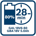 Bosch Ladegerät GAL 18V6-80Mit dem GAL 18V6-80 ist ein kontinuierliches Laden in zwei Zyklen während der Arbeit oder über Nacht möglich.