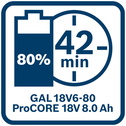 Dank eines Ladestroms von 8 A werden ProCORE18V 8.0Ah-Akkus in nur 42 Minuten bis zu 80 % geladen.